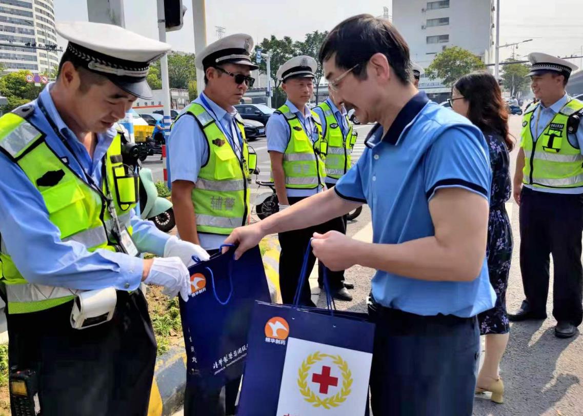 8月12日上午,精華制藥集團(tuán)和南通市紅十字會(huì)相關(guān)負(fù)責(zé)同志來(lái)到南通市公安局交警支隊(duì)四大隊(duì)及四大隊(duì)所轄兩個(gè)路段,慰問(wèn)高溫下堅(jiān)守崗位的一線交警。精華制藥集團(tuán)監(jiān)事會(huì)主席薛紅衛(wèi)和南通市紅十字會(huì)黨組成員朱建新將季德勝健膚皂、潔面乳及防疫藥茶等防暑防疫物資送到路面執(zhí)勤的交警手中,向他們表達(dá)了由衷的敬意。